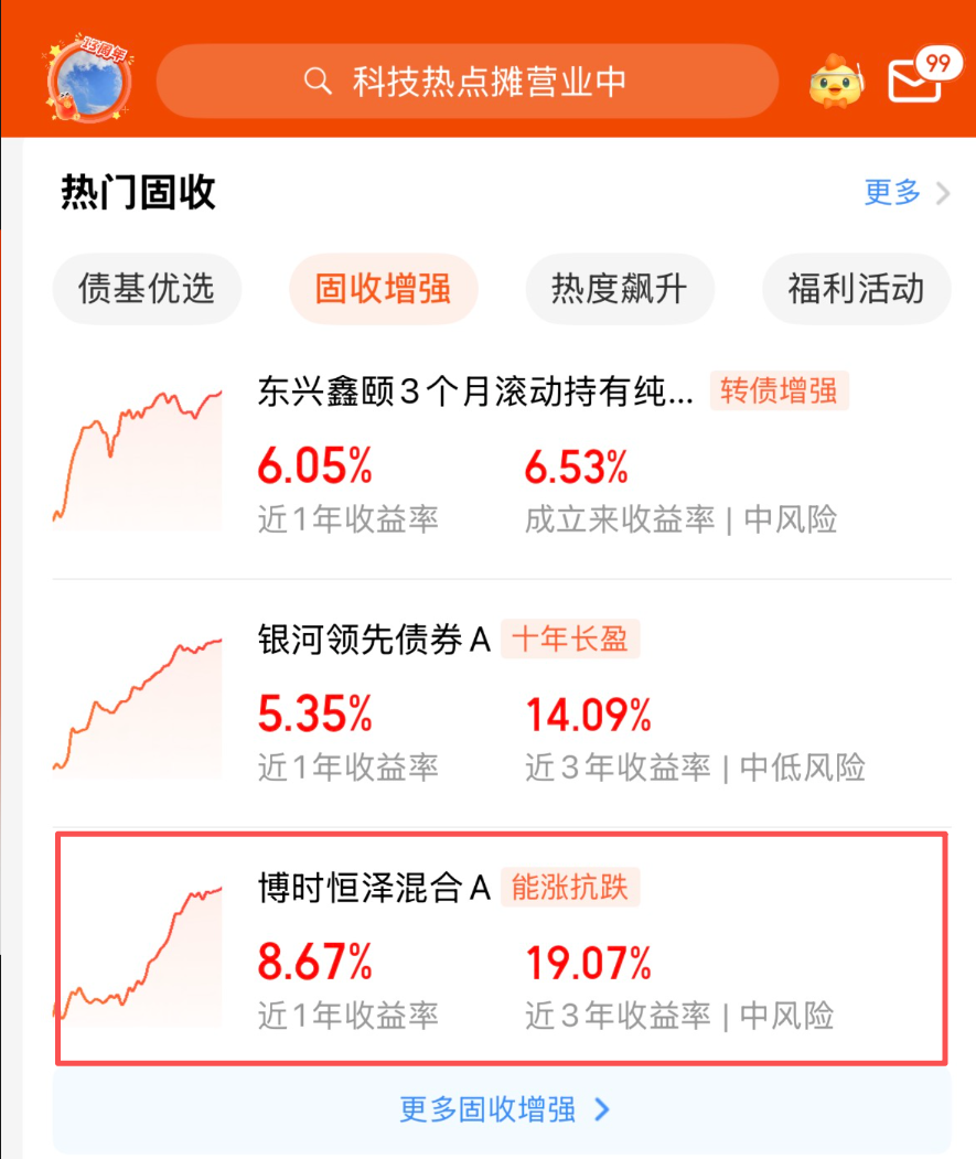 博时恒泽混合C近1年涨幅为8.19%,登上了天天基金的热门固收增强榜单,平台认可度也很高。