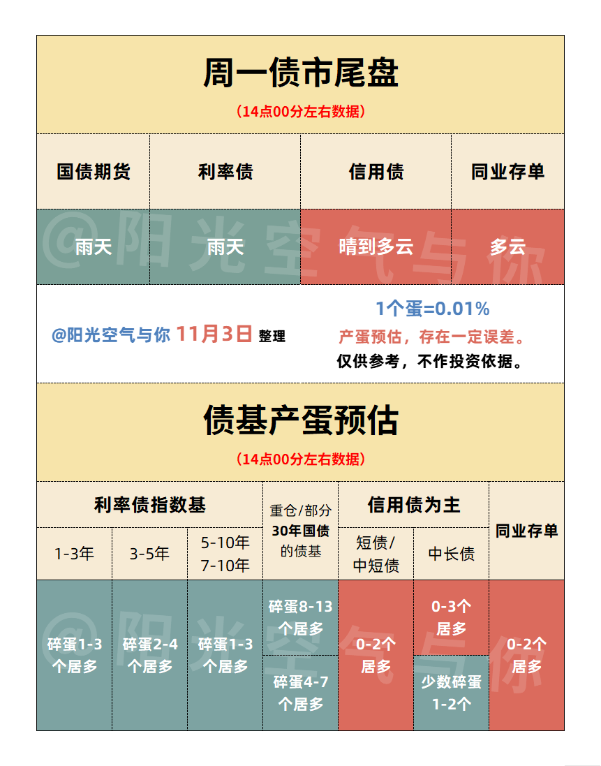尾盘产蛋预估:信用债为主的债基多数小产蛋,利率债为主的债基则是小碎蛋。混债基金应该产蛋会超过一半。17点30分左右还有一次债基收盘预估。
