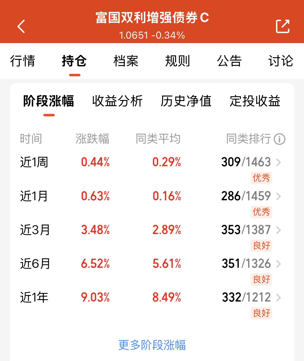 (2)今天阳光个人建仓富国双利增强债券C,近1年涨幅9.03%,稳稳跑赢同类平均的8.49%,而且回撤控制出色(近1年最大回撤仅2.01%),优于多数同类产品,跌后修复速度也很快(近1年净值天数仅14天),整体攻防兼备的固收+基金。富国双利增强主投流动性高的利率债,同时通过18%股票和10%可转债进行收益增强,其权益部分侧重有色、非银金融以及商贸零售行业,覆盖A股和港股市场,配置更加均衡分散,应该也是波动较小原因之一。现阶段债市进入修复阶段,股市高位震荡;想要参与股市行情,又想稳一点,那么这一类固收+基金会是兼顾收益和风险的稳妥选择,所以个人打算接下来陆续配置。