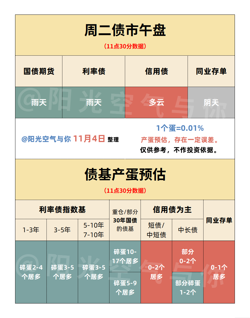 午盘产蛋预估:利率债基金小碎蛋,信用债为主的债基部分产蛋。混债基金预计大部分也会碎蛋。
