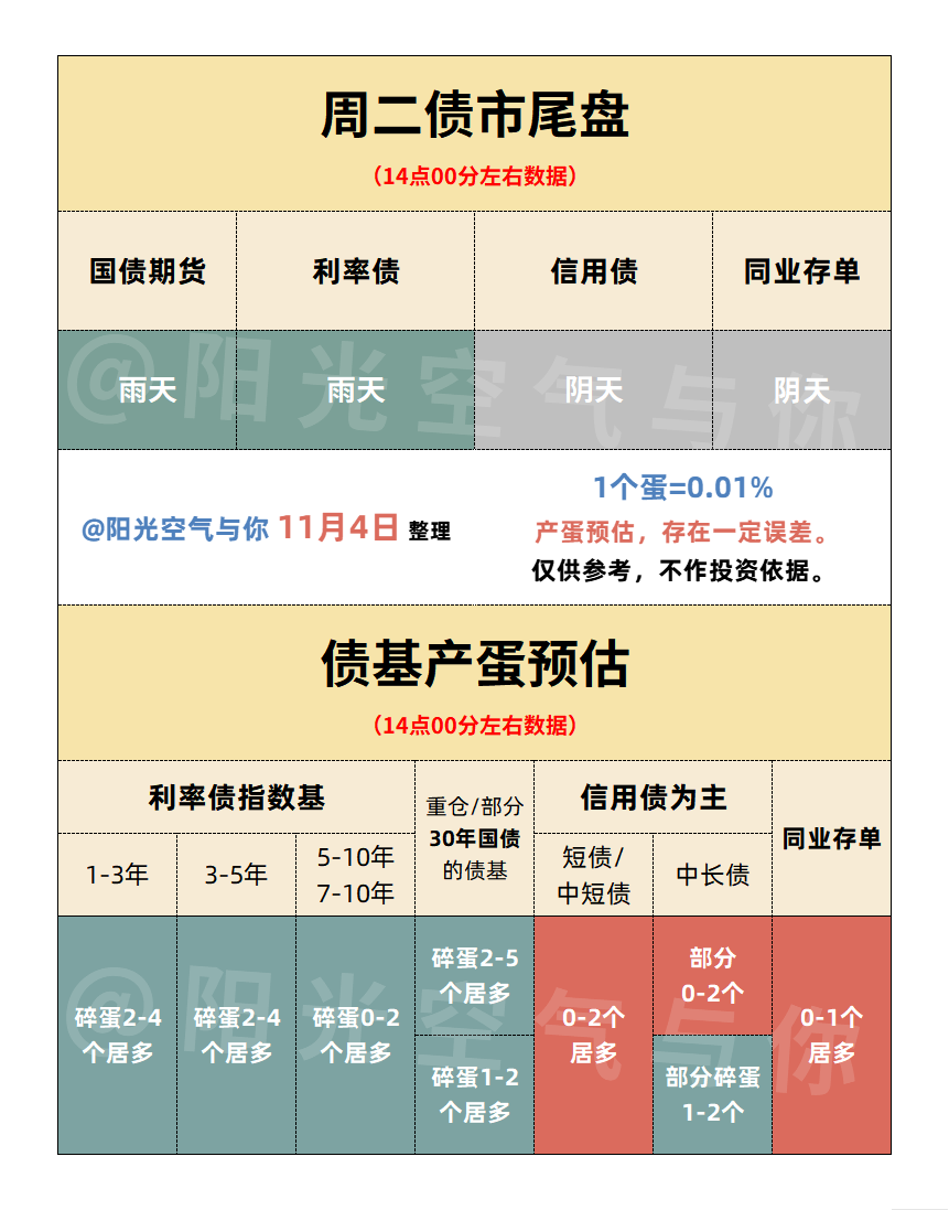 尾盘产蛋预估:利率债基金碎蛋数量明显减少,信用债多数仍有望产蛋或0蛋。混债基金预计大部分碎蛋。17点30分左右还有一次债基收盘预估。