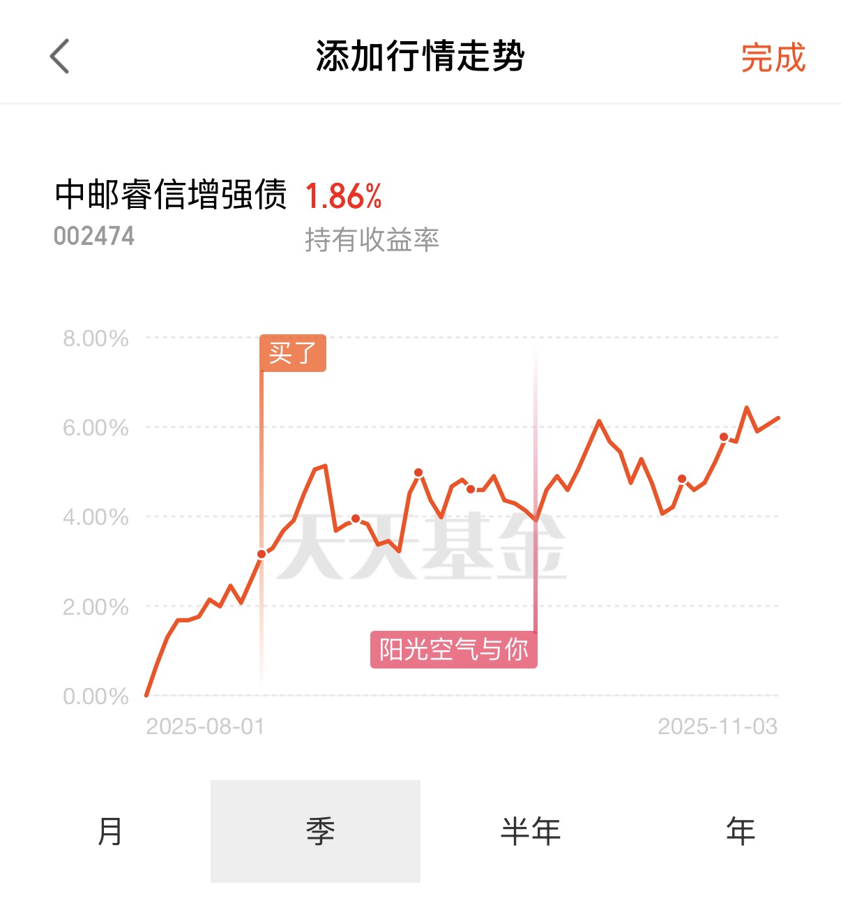 (1)今天阳光个人继续加仓中邮睿信增强债券,近1年涨幅17.44%,昨天产蛋11个,是一只经常有爆蛋惊喜的固收+基金,仅在10月份就有5次单日产蛋50个及以上,上涨势头强劲。中邮睿信增强债券的权益部分较高,可转债和股票合计仓位超60%。所以进攻性会更强!不过,基金在三季度已经主动下调了20%多的可转债仓位,增配利率债,所以近3个月的回撤控制明显更好了。股票部分继续维持偏哑铃结构,重点布局交通运输、国防军工以及有色金属行业,整体风格均衡分散。当前A股处于高位震荡,想要适当参与股市,又想要稳一点的话,兼顾收益和风险的固收+基金会是更优的选择,趁着今天市场回调,个人继续分批入场。