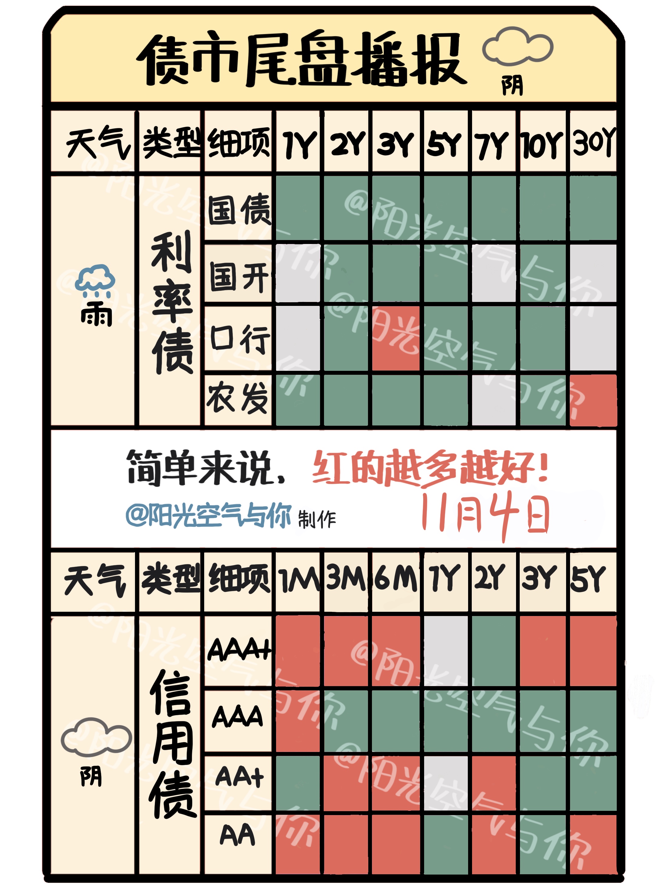 (1)央妈已经下场买债了吗?进入11月之后债市的波动幅度明显缩小。除了资金面、基本面支撑外,主要利好就是央妈重启国债买卖,目前市场可能等待这两天会公布买债规模等信息,快的话今晚就会公布。所以资金参与较为谨慎,债市维持窄幅震荡。另外,A股市场正处于突破4000点位大关之后的高位震荡回调(上证指数下跌0.72%,中证转债下跌0.68%),所以也是利好债市。