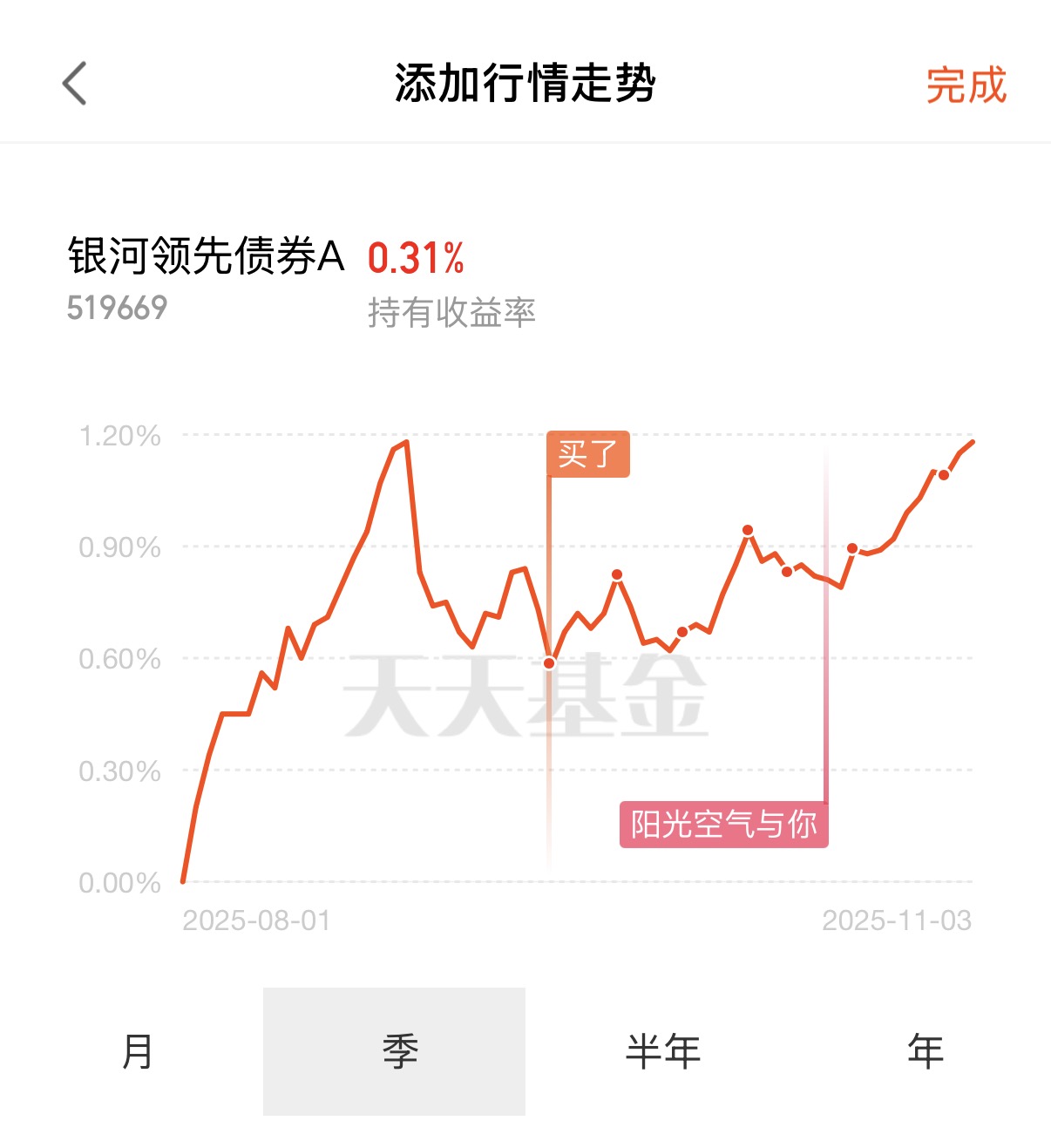 (2)今天阳光个人加仓银河领先债券A,近1年涨幅5.38%,稳稳跑赢债券型-混合一级同类平均的4.67%,近10个交易日中有8天实现正收益,而且成立12年以来年年正收益,长短期业绩都很稳健。银河领先债券A主要配置利率债和高等级信用债,积极参与长端利率债的波段交易。约7%的可转债仓位则以双低策略为核心,并通过量化模型精选优质个券,方法更加科学。另外,还是金牛基金经理管理,投研实力很强。基金回撤控制表现突出,近1年回撤仅0.62%,甚至比大多数纯债回撤更低。而且跌后修复能力强(近1年净值修复天数为40天),是一只长期低波动、稳增长的固收+基金,趁着今天市场回调,个人继续分批入场。
