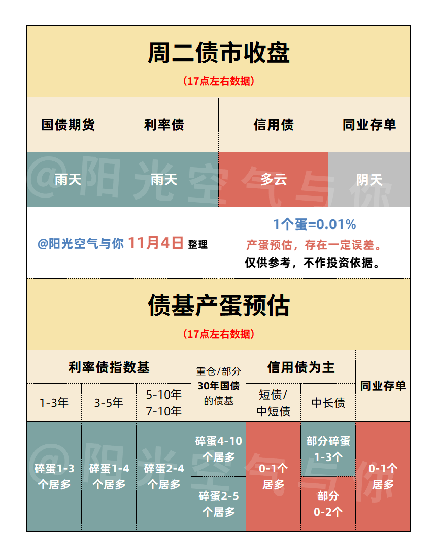 收盘产蛋预估:利率债基金还是小碎蛋,信用债中长债涨跌都有可能。短债/同业存单基金可能小产蛋。混债基金大部分应该会碎蛋。