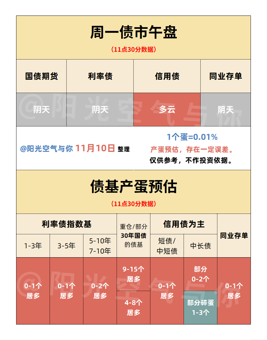 午盘产蛋预估:纯债基金多数产蛋,30年国债基金有望9-15个居多。不过信用债中长债基金可能部分会碎蛋。混债基金预估是涨跌各半。