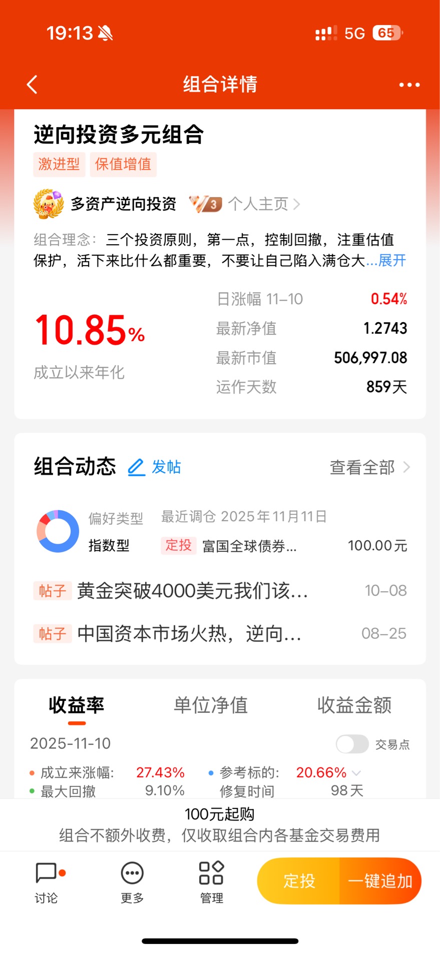 逆向投资多元组合,成立运作800多天,组合年化收益超10%,累计收益超10万,更难能可贵的是组合波动、最大回撤都不错,持有的体验感很好,持有这样的不容易拿不住,卖飞,或者割肉。