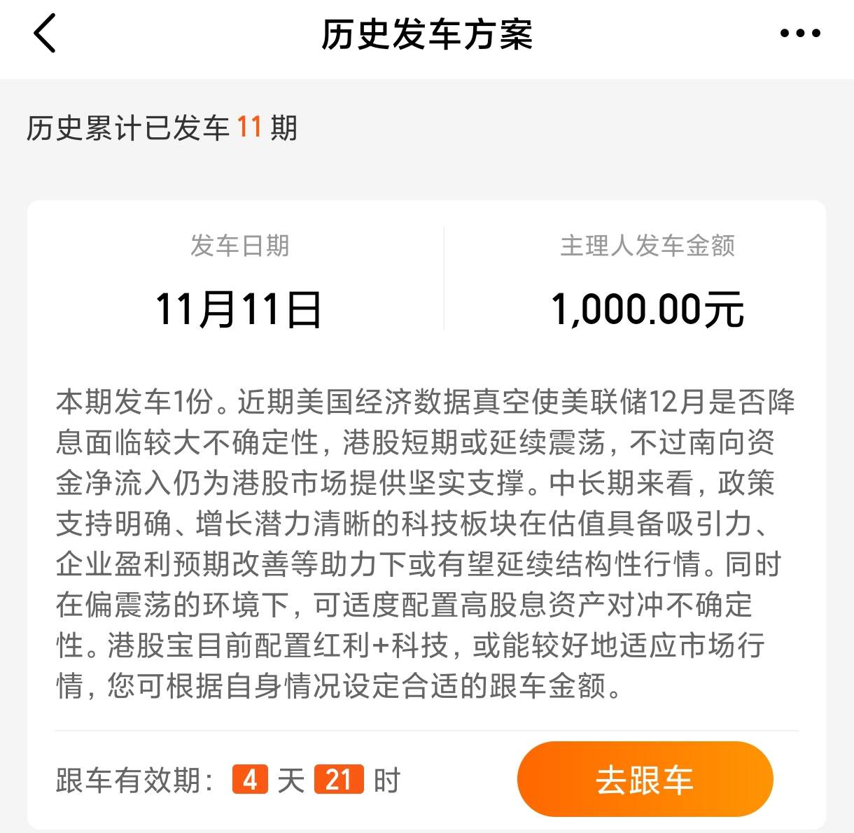 至于当下的时点适不适合上车港股宝组合?主理团队也通过港股宝的发车信号告诉了我们——11月11日新鲜出炉的发车买入信号是1份,给出的解读也进一步佐证了“高股息+科技”的哑铃策略对市场环境的适应能力。
