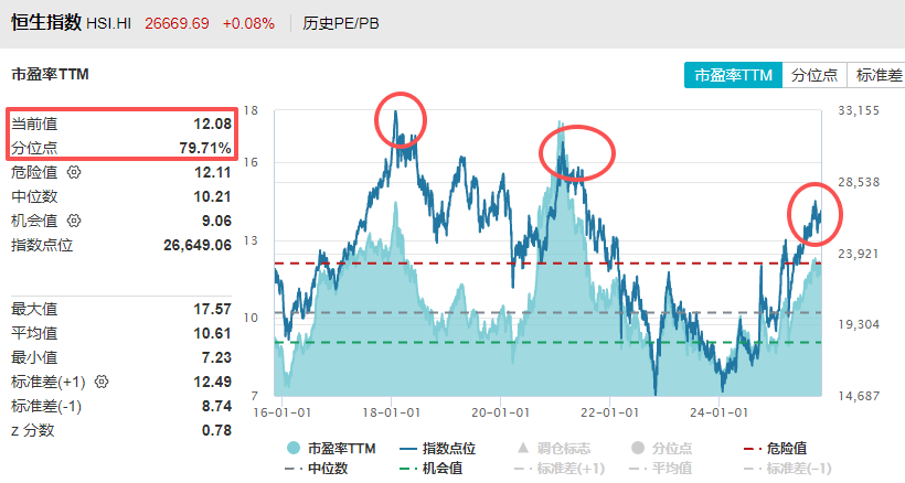 首先是估值上。恒生指数当前的PE是12.08倍,PE百分位是79.71%,虽然估值也不低,但和A股的“高高在上”相比还是好不少。