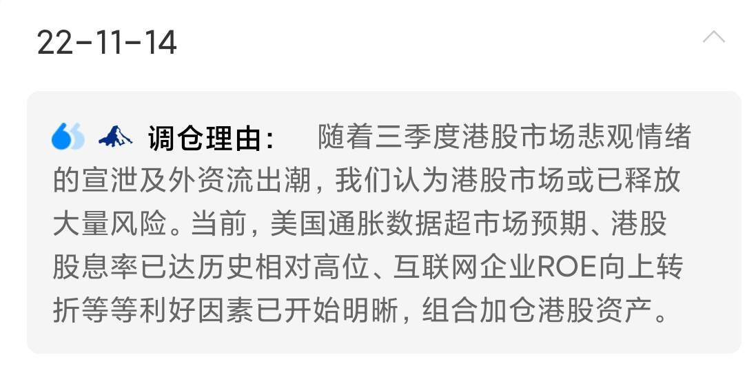 比如2022年11月,港股的至暗时刻,也是港股行情的一个大底部,主理团队判断大跌已经反映了资金对港股的悲观情绪,且利好因素开始明晰,选择逆势加仓港股资产,很好的把握住了机会。