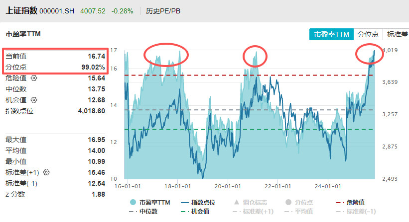 随着行情创出十年新高,上证指数的PE也来到了16.74倍的高位,和2018年初、2021年初,前两轮牛市顶部的估值相当。