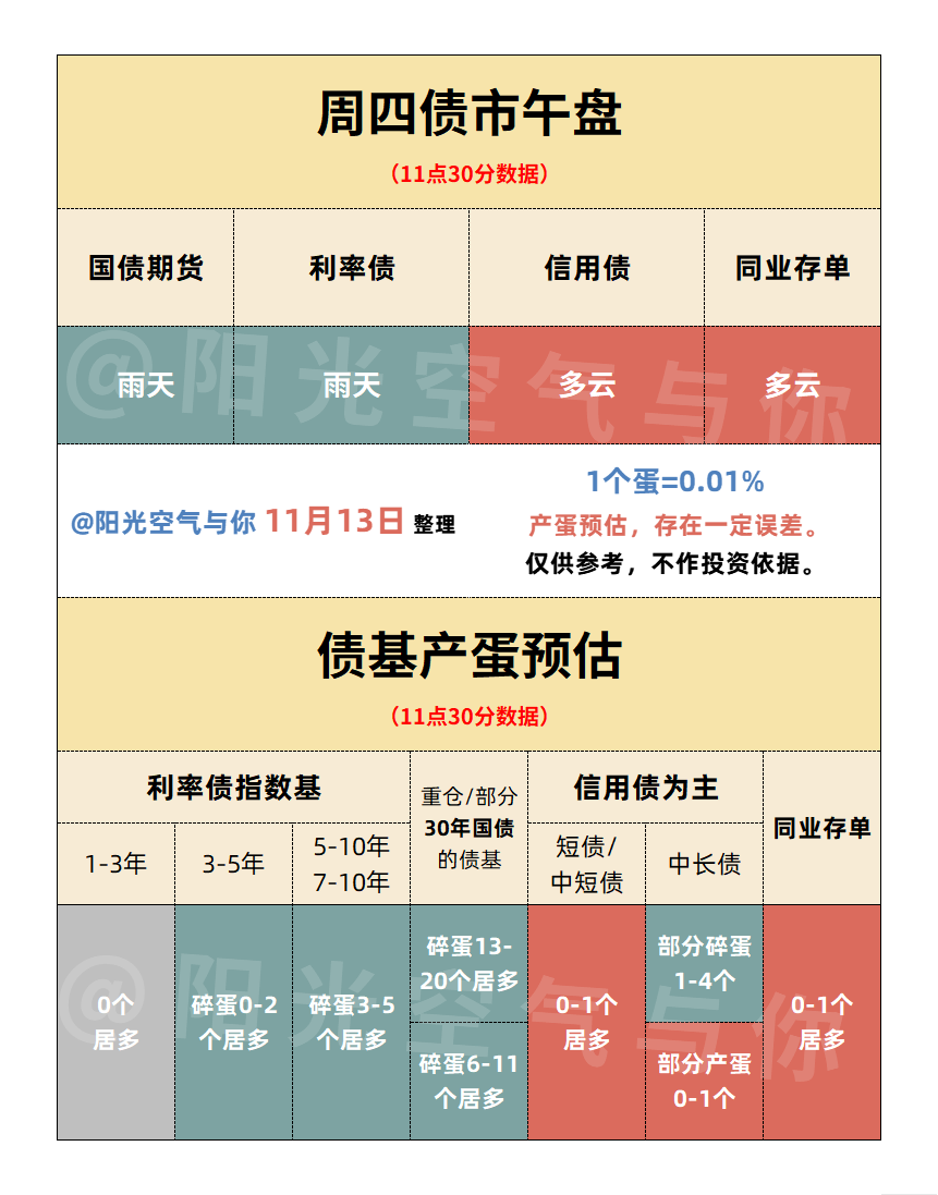 午盘产蛋预估:重仓30年国债的基金碎蛋13-20个居多。信用债基金部分有望产蛋。混债基金预计大多数都能产蛋。