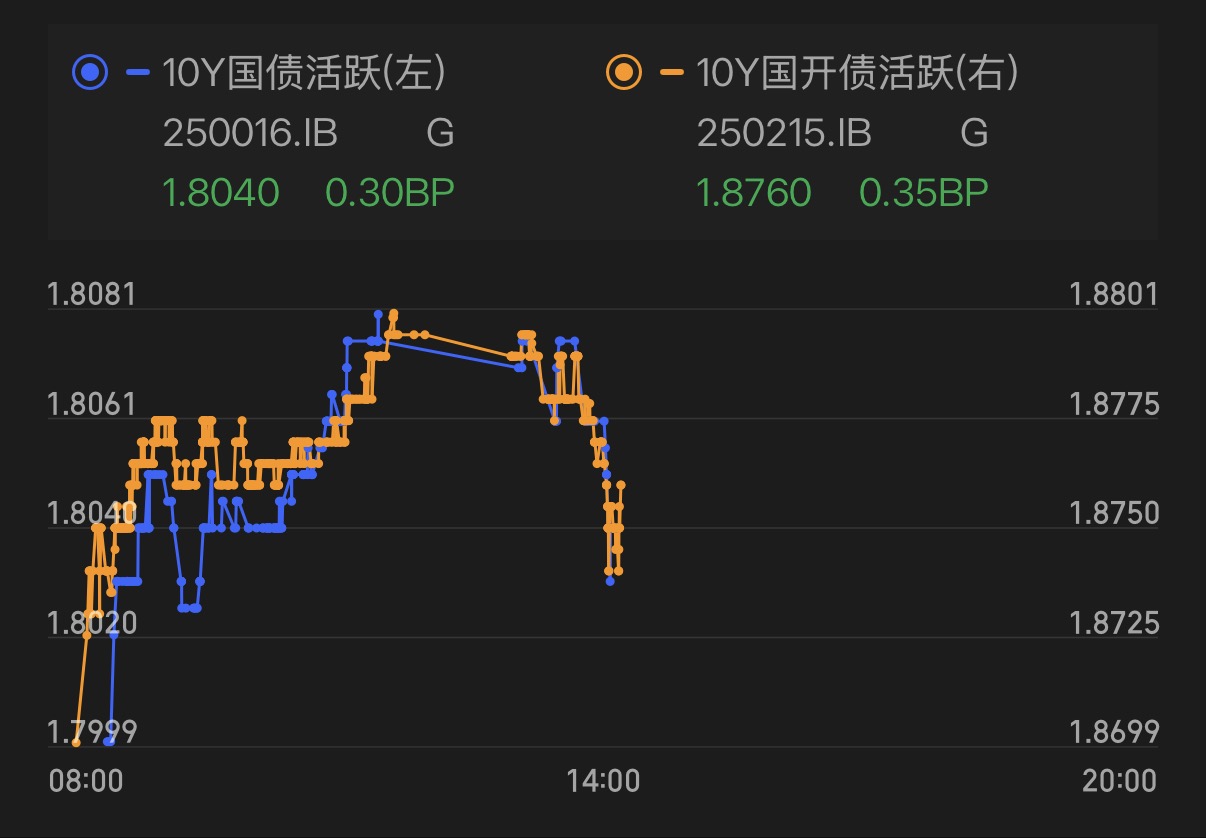 午后A股继续走强,不过债市午后也回升了一些,利率债盘面跌幅明显缩小了。目前10年期国债活跃券收益率仅小幅上行。