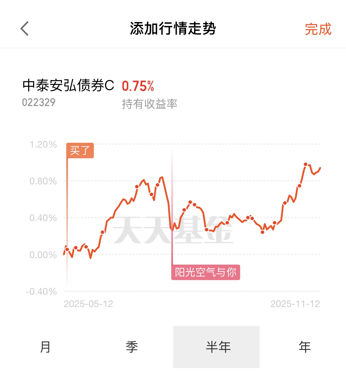 (1)今天阳光个人加仓中泰安弘债券C,这周3连涨了!今年来涨幅2.95%,大幅跑赢同类平均的1.00%,是今年极少数能够跑出较多超额收益的主动债基。具体来看,中泰安弘主要持仓AAA级信用债,并辅以利率债的波段操作,值得注意的是前五重仓债券中还有1只30年国债,使其能够较为深度地参与市场波段。更为难得的是基金的波动和回撤并没有因此明显放大,近1年最大回撤仅1.19%,这背后的原因:除了基金经理操作灵活外,还得益于积极通过国债期货工具为本基金进行套期保值操作,有效降低了整体波动,持有体验明显更好,趁着今天债市震荡偏弱,个人闲钱继续加仓,累计持仓2w多。