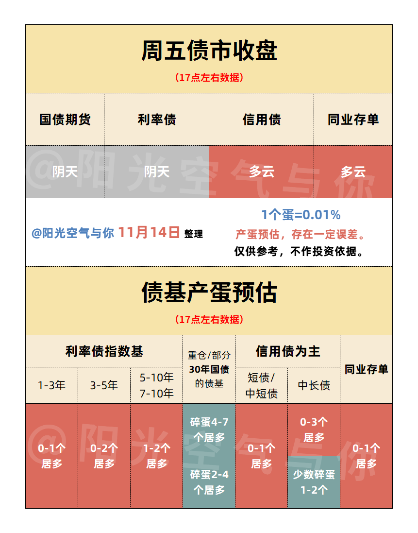 收盘产蛋预估:重仓30年国债的基金、以及少数信用债中长债基金可能小碎蛋,其他纯债小产蛋为主,混债基金预计大多数碎蛋,而且部分可能会有点心疼了。更多下周债市展望,还是周日再聊。