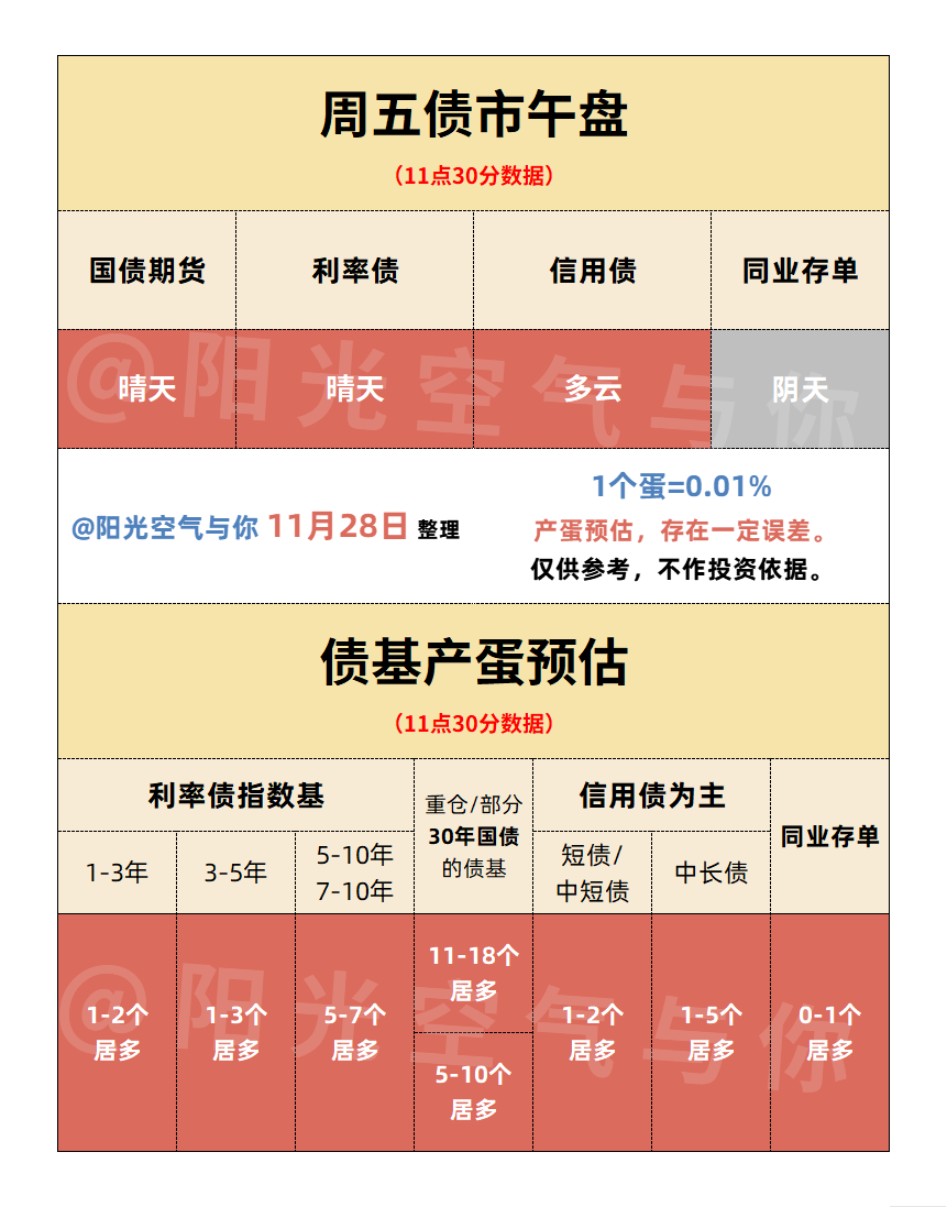 午盘产蛋预估:纯债基金普遍产蛋,不过有望10个及以上的只有重仓30年国债的基金,混债基金今天预计大部分有望产蛋。
