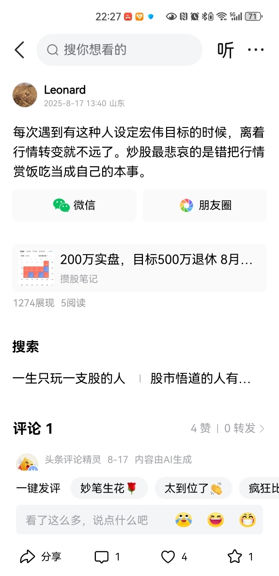 每次遇到有这种人设定宏伟目标的时候,离着行情转变就不远了。炒股最悲哀的是错把行情赏饭吃当成自己的本事。