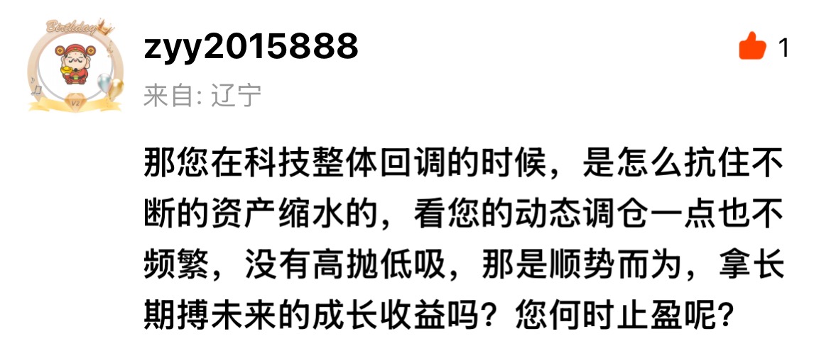 前几天一位基民给我留言:“那您在科技整体回调的时候,是怎么抗住不断的资产缩水的,看您的动态调仓一点也不频繁,没有高抛低吸,那是顺势而为,拿长期搏未来的成长收益吗?您何时止盈呢?”