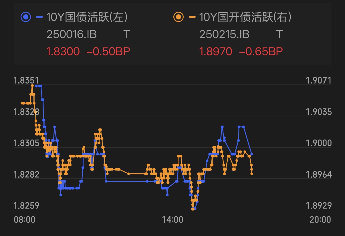 今天盘中债市波动不大,整体延续涨势,特别是利率债红彤彤的。目前10年期国债活跃券收益率刚好下行0.5BP。
