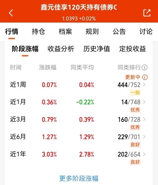 鑫元佳享120天债C阶段表现亮眼:近1月涨0.36%(同类平均-0.22%),近