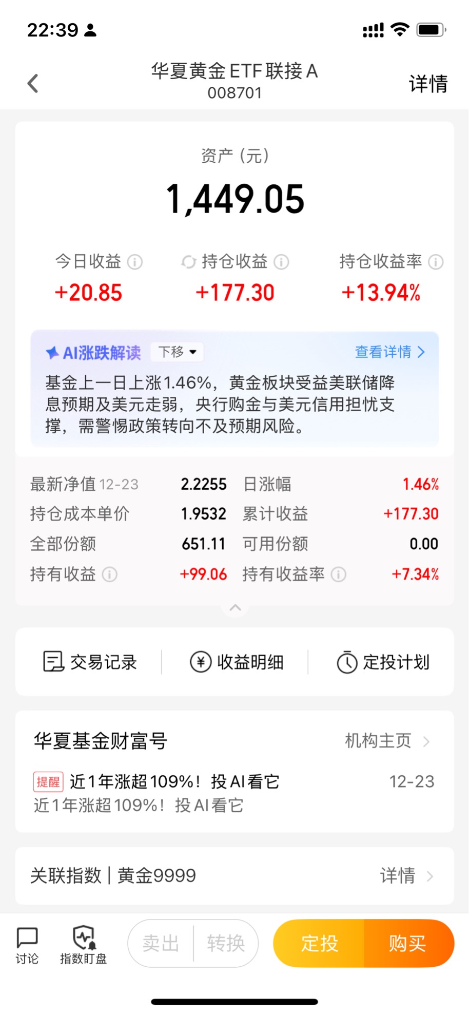华夏黄金ETF盈利赎回,近7个点,赚177.3元