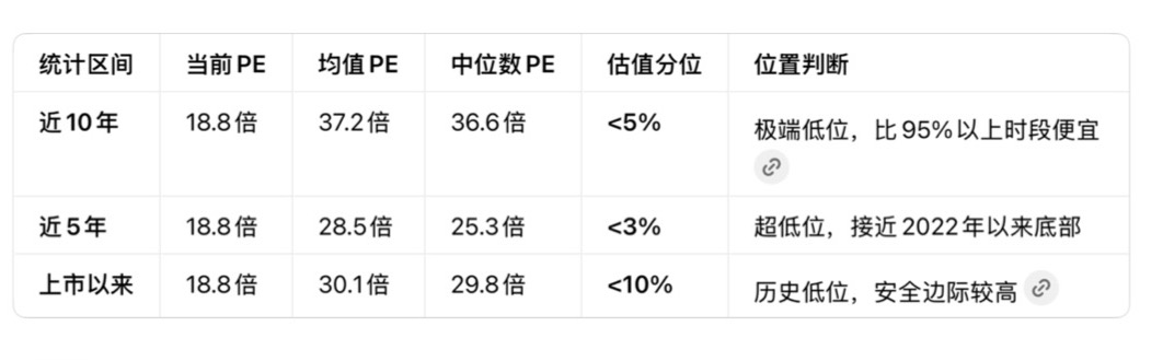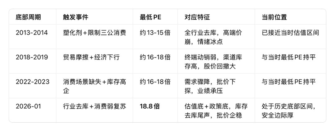 截至2026-01-30,中证白酒指数PE(TTM)约18.8倍,处于上市以来<10%、近10年<5%的历史极低分位,接近2013/2018/2022三轮极端底部区间。