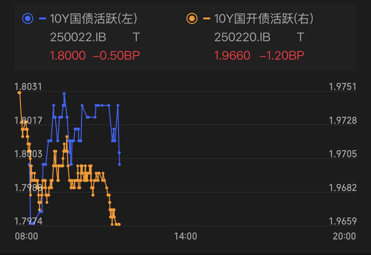 今天债市比预期的强啊!目前10年期国债活跃券收益率下行,10年期国开债活跃券收益率更是下行超1BP。