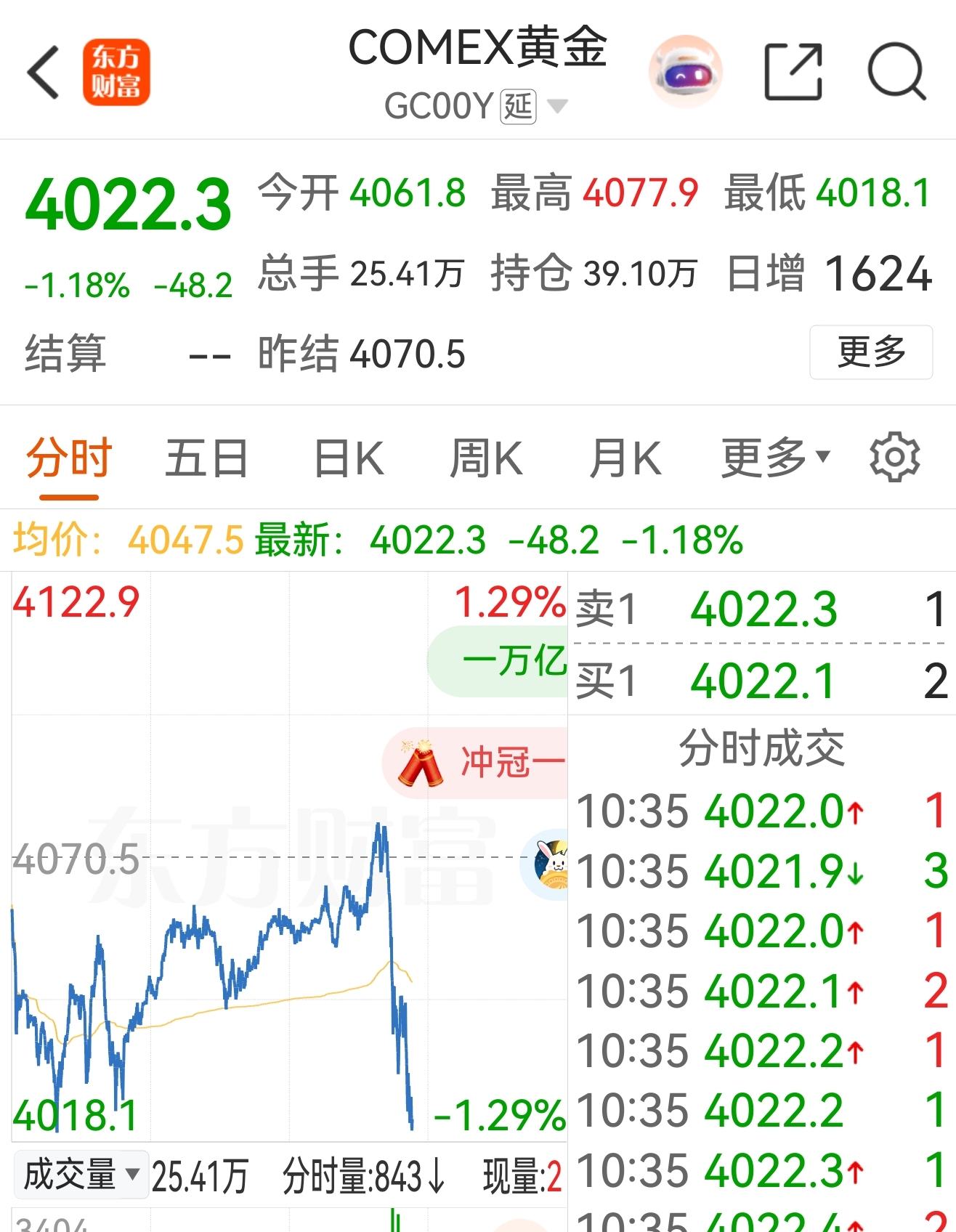 Comex黄金垂直跳水,离4019.2越来越近,将要冲击4000大关;