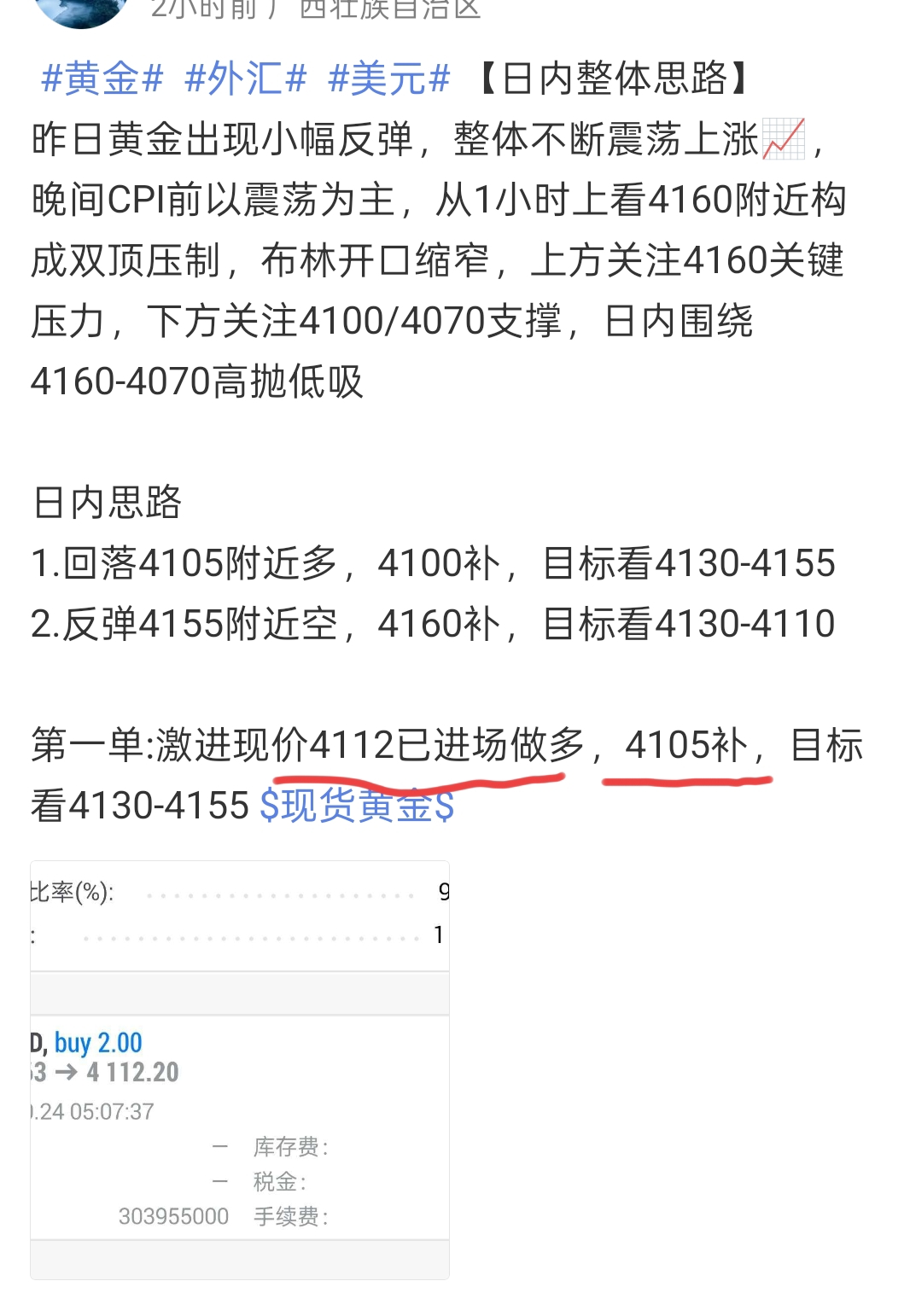 【回落多单加仓进场】回落4105多单加仓进场,第一单4112的多单继续持有,目前