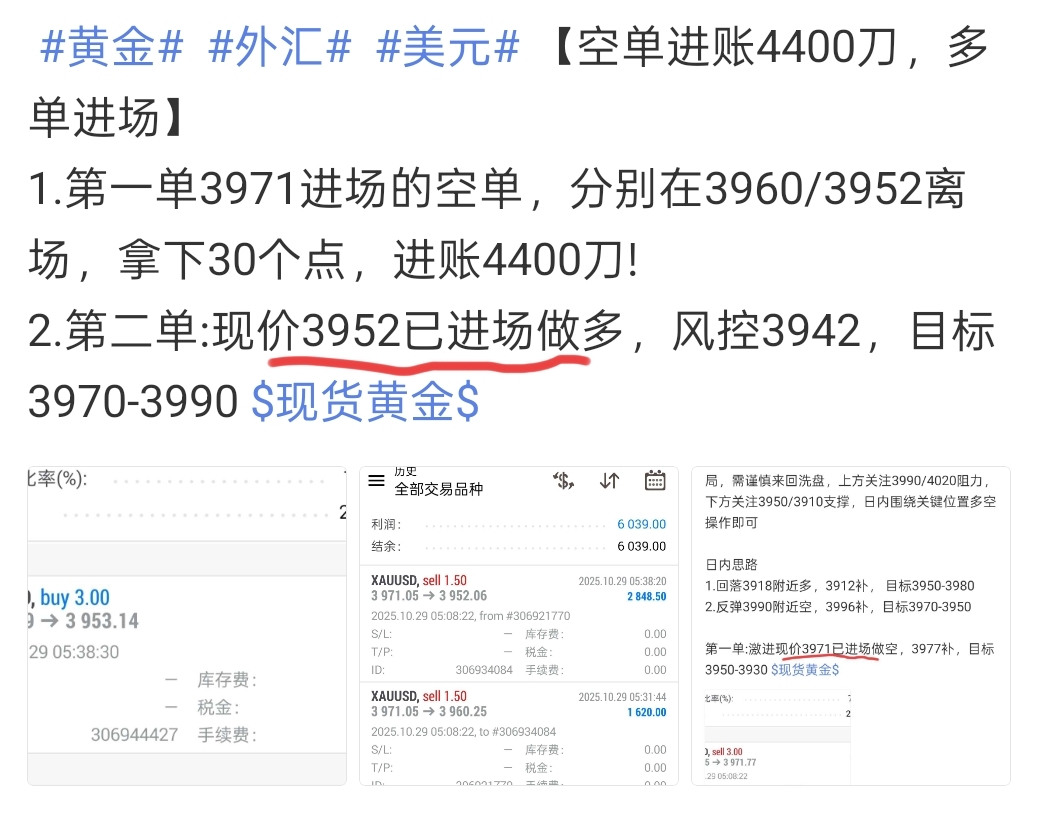【多单减仓进账1500$】1.第二单3952进场的多单,在3962减仓,拿下10
