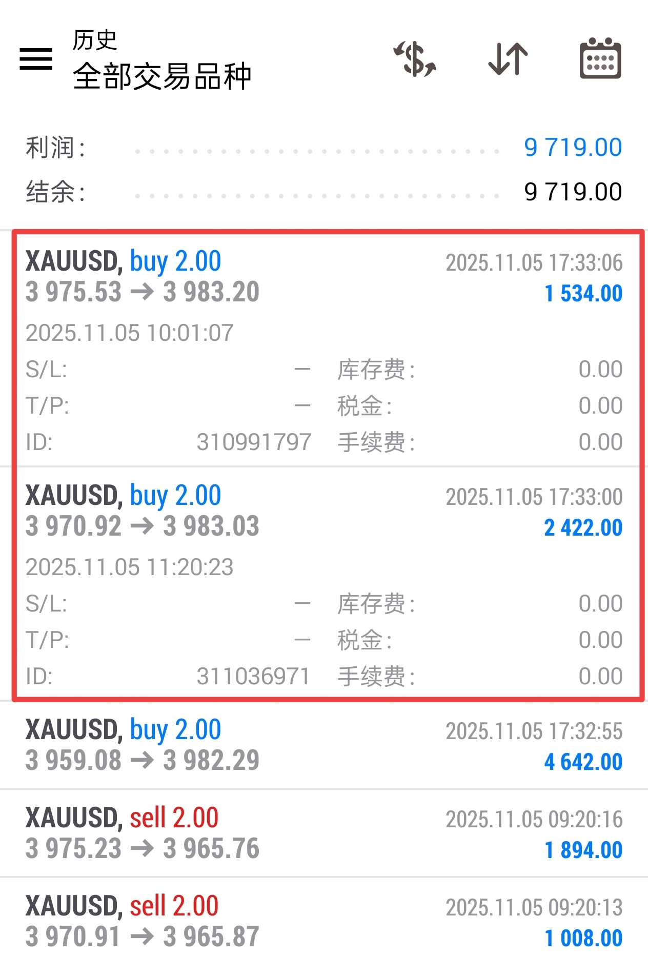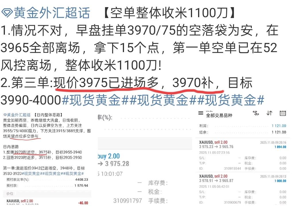 第三单3975/70进场的多单,全部在3983离场,共拿下21个点,收米4000刀!
