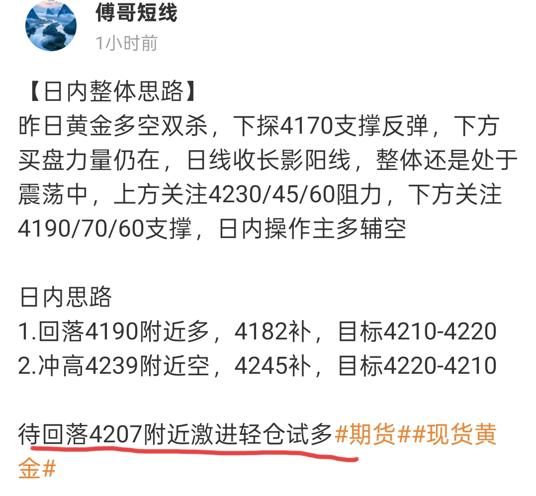 【多单进场】第一单:现价4207激进轻仓进场多,4202补,目标4220
