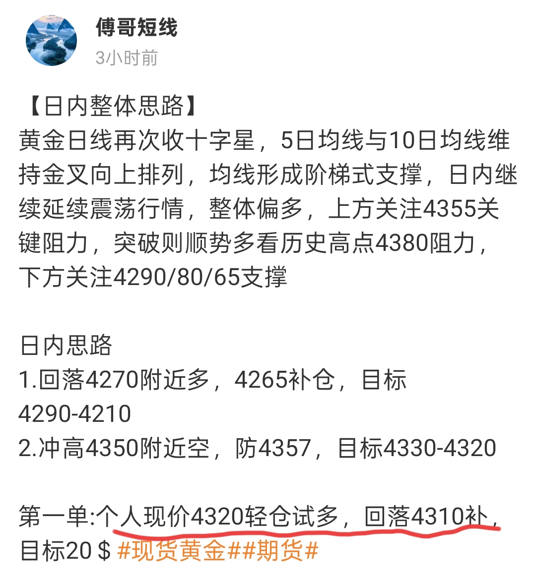 目前已空仓观望,下一单预计4350附近空或回落4310附近多!