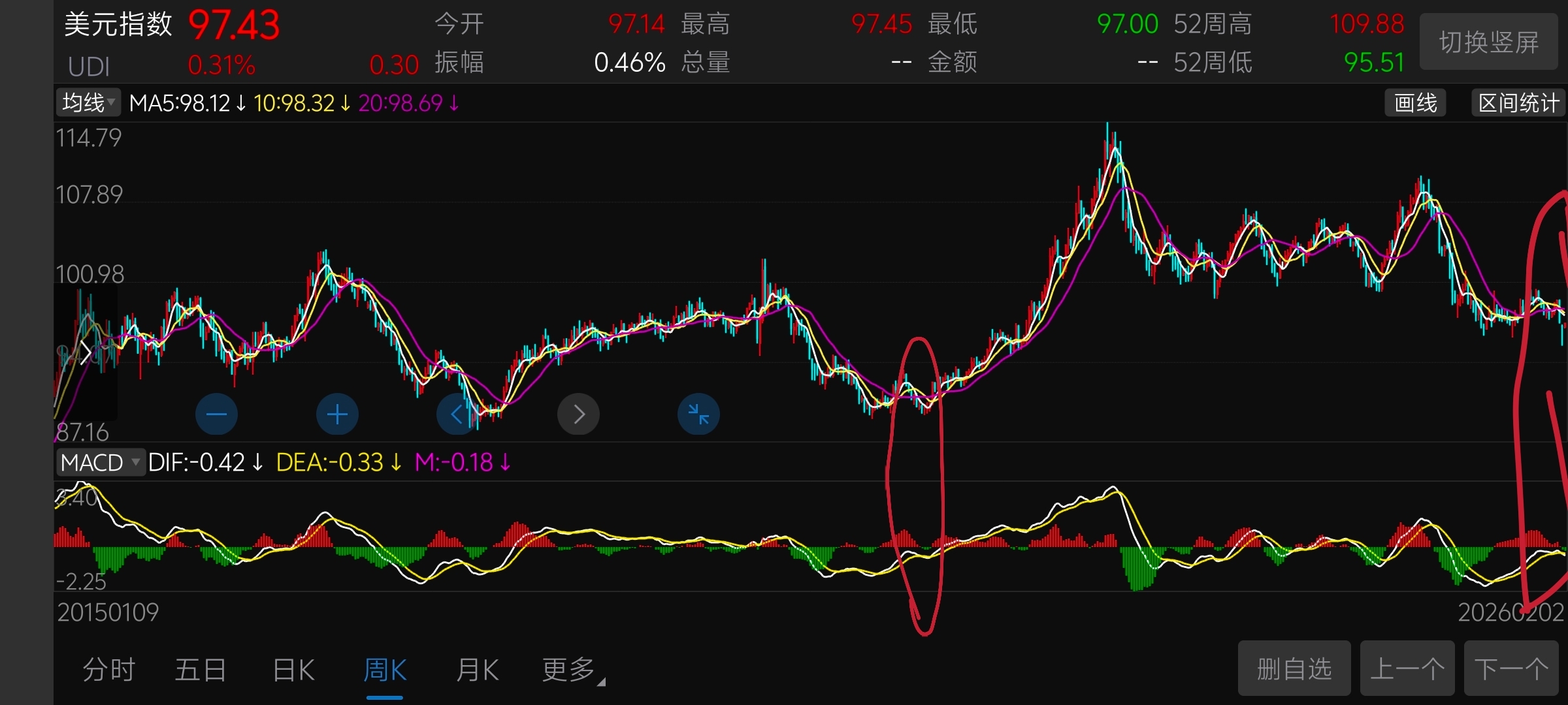 $美元指数(QQZS|UDI)$ $黄金/美元(FORPM|XAU)$ 美元指数这里像不像2021年5月至6月的位置?感觉就是要爆拉一波。所以黄金白银暴跌是有道理的。