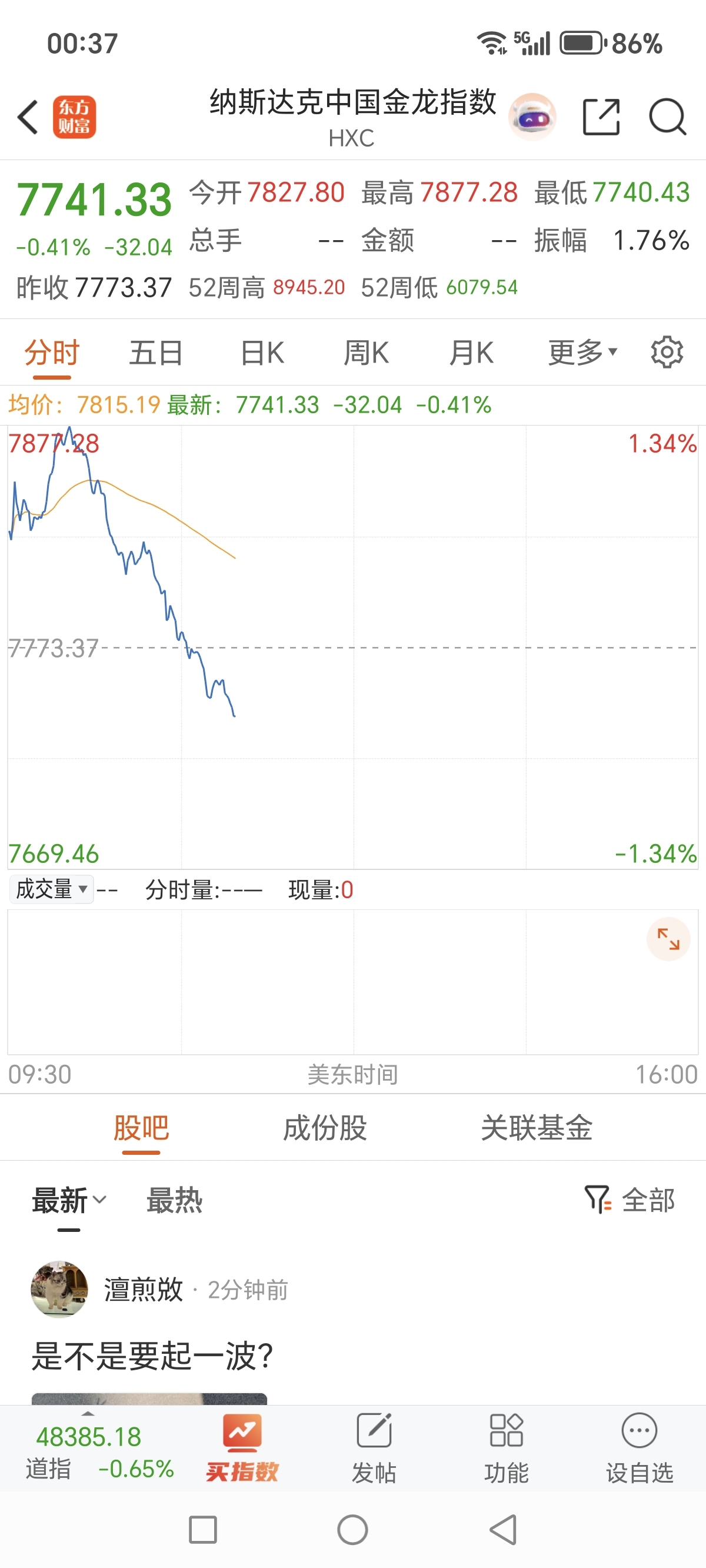 $纳斯达克中国金龙指数(NDI|HXC)$ $上证指数(SH000001)$ $航天动力(SH600343)$ 纳斯达克中国金龙指数高开低走,周一A股似乎不妙