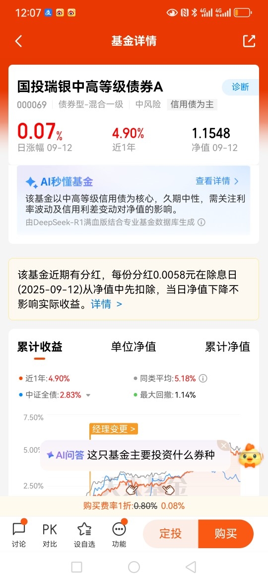 最近一段时间债市又有所回撤,纯债表现相对比较稳健,可以积极配置。$国投瑞银中高等级债券A$ 是纯债基金中的佼佼者,年年正收益不是盖的,可以积极参与。