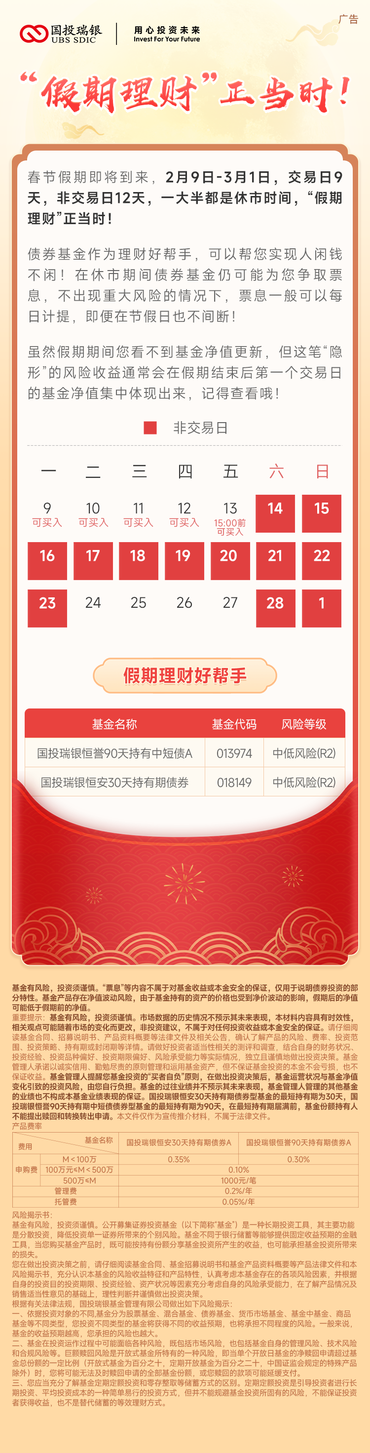$国投瑞银恒安30天持有期债券A(OTCFUND|018149)$$国投瑞银恒安30天持有期债券C(OTCFUND|018150)$$国投瑞银恒誉90天持有期中短债A(OTCFUND|013974)$$国投瑞银恒誉90天持有期中短债C(OTCFUND|013975)$$国投瑞银恒泽中短债债券A(OTCFUND|005725)$$国投瑞银恒泽中短债债券C(OTCFUND|006553)$#春节AI大战!千问发动30亿奶茶功势##八部门重磅方案!中药产业迎五年机遇期##黄金白银再现深V!贵金属后市到底怎么看?#