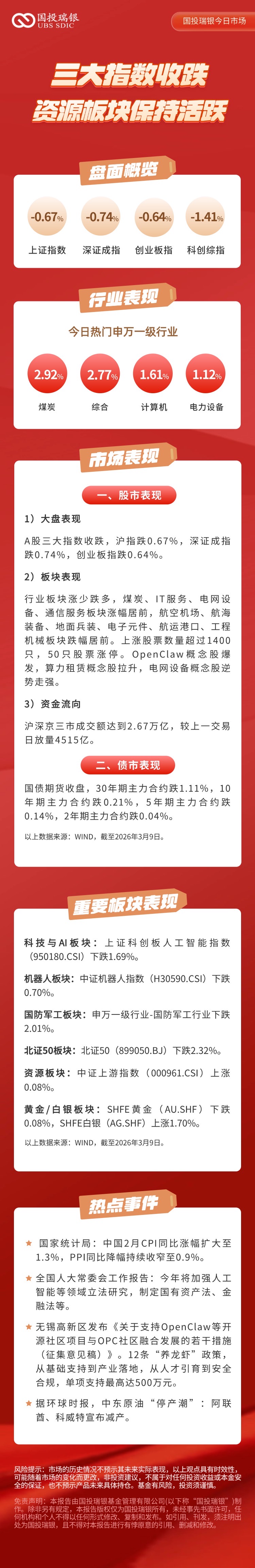 3月9日:三大指数收跌,资源板块保持活跃!