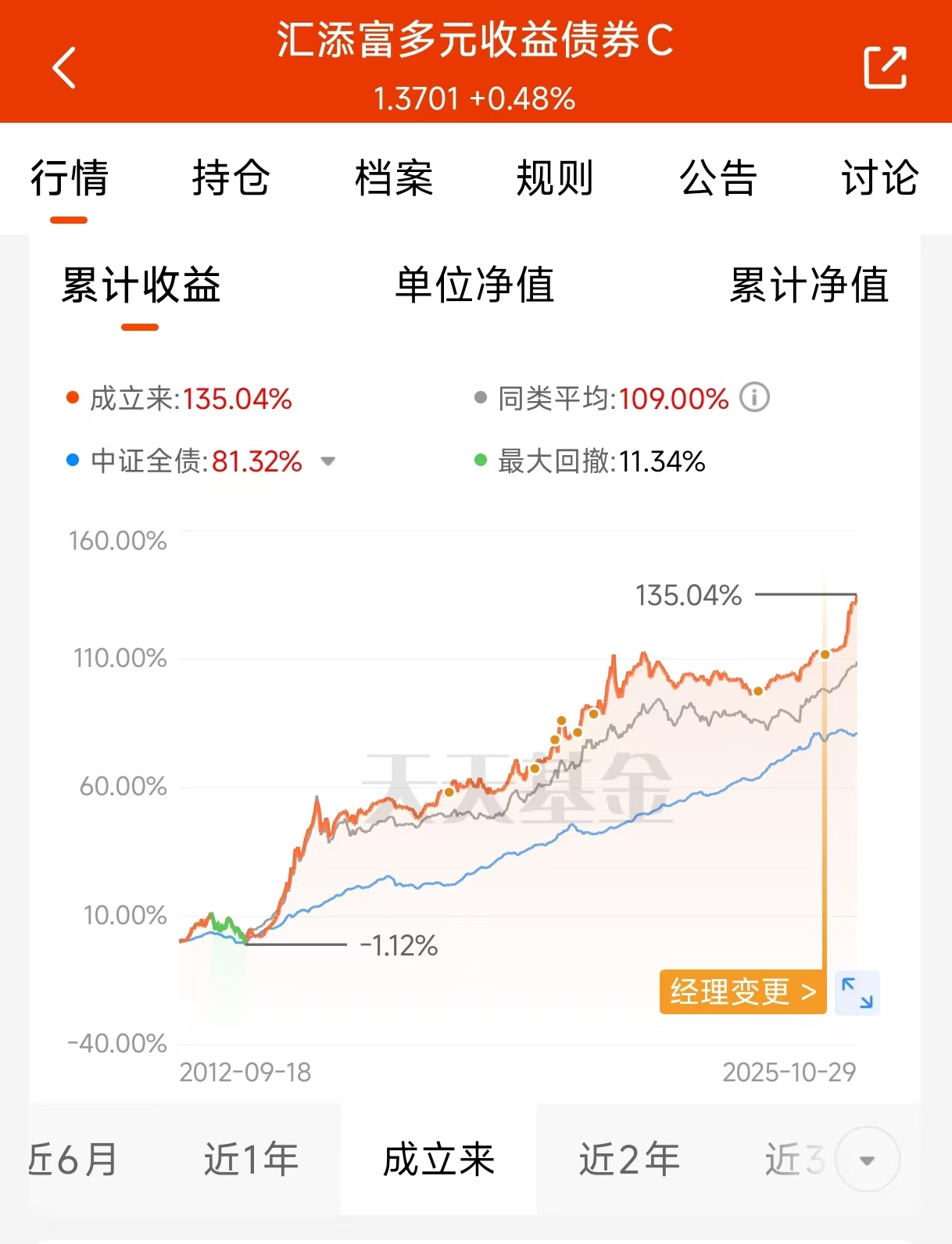 最后分享一个体会:投资不是比谁跑得快,而是比谁走得远。$汇添富多元收益债券C$(470011)这类“固收+”产品,通过债券和股票的动态搭配,追求长期稳健回报。它的优势在于,债券部分提供稳定现金流,权益部分把握科技等成长方向,而且基金经理会根据估值和周期调整仓位。近三年其年化收益5.09%,成立以来年化6.73%,累计超额收益超过58%,明显优于银华盛泓债券A(020955)。如果你希望资产在控制波动的前提下逐步增长,不妨关注这类产品,用时间和配置来积累财富。#A股突破4000点!下个目标位在哪?#