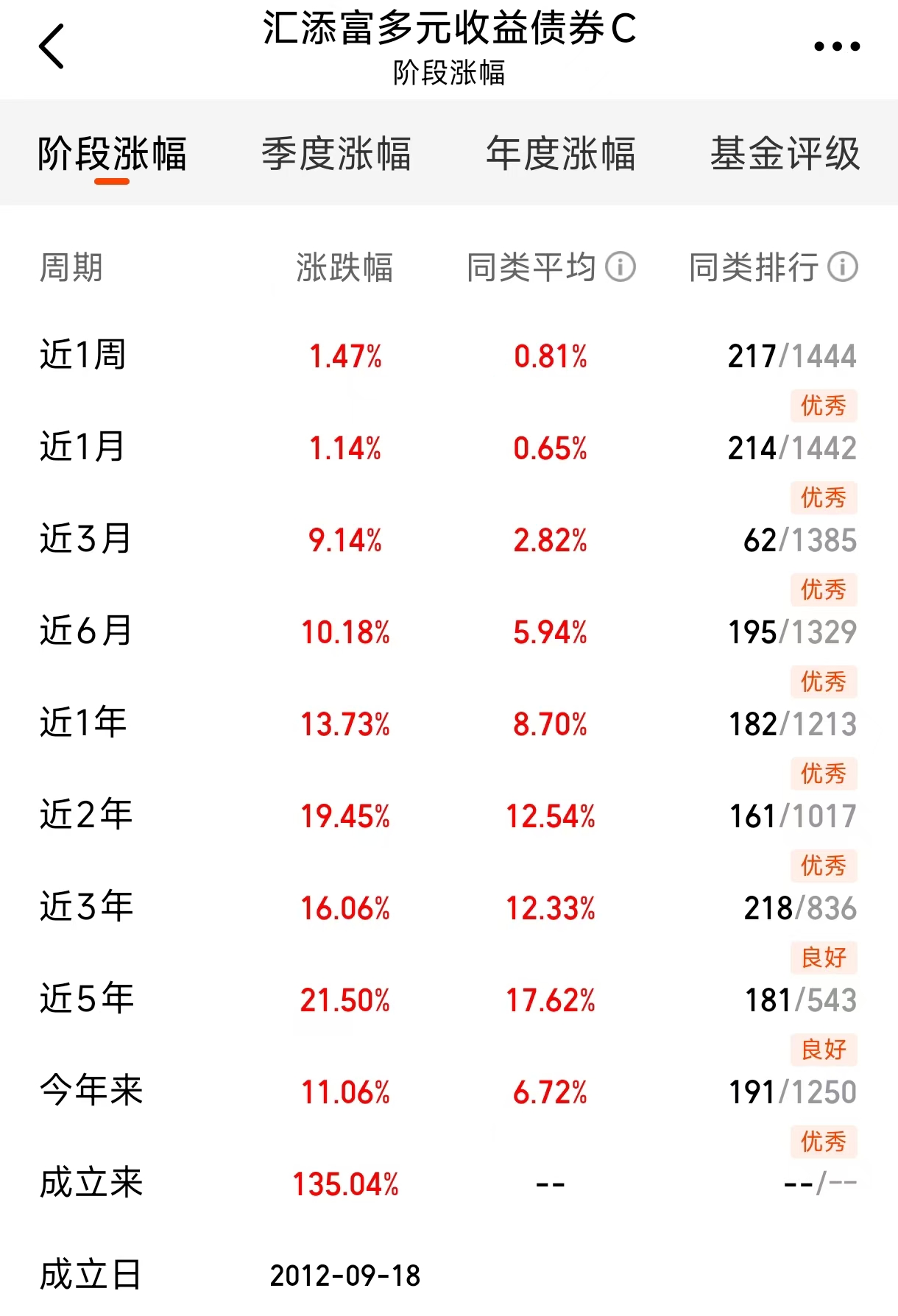 为啥我敢在牛市里重仓“固收+”?因为行情不会马上结束,但波动难免啊!$汇添富多元收益债券C$(470011)最让我放心的是它的波动控制——近一年最大回撤只有1.92%,虽然同类排名不算顶尖,但结合它13.73%的近一年收益,性价比很高了,2.98的夏普比显著优于南方津享稳健添利债券C(018472)的1.68。它的权益仓位严格限产,行业分散在电子、通信、电力设备等领域,前十大重仓占比才67%,科技行情来了能抓,没行情也能守,这种设计就像开车系了安全带,哪怕市场急转弯,也不至于被甩飞。#科技热点摊开业啦#
