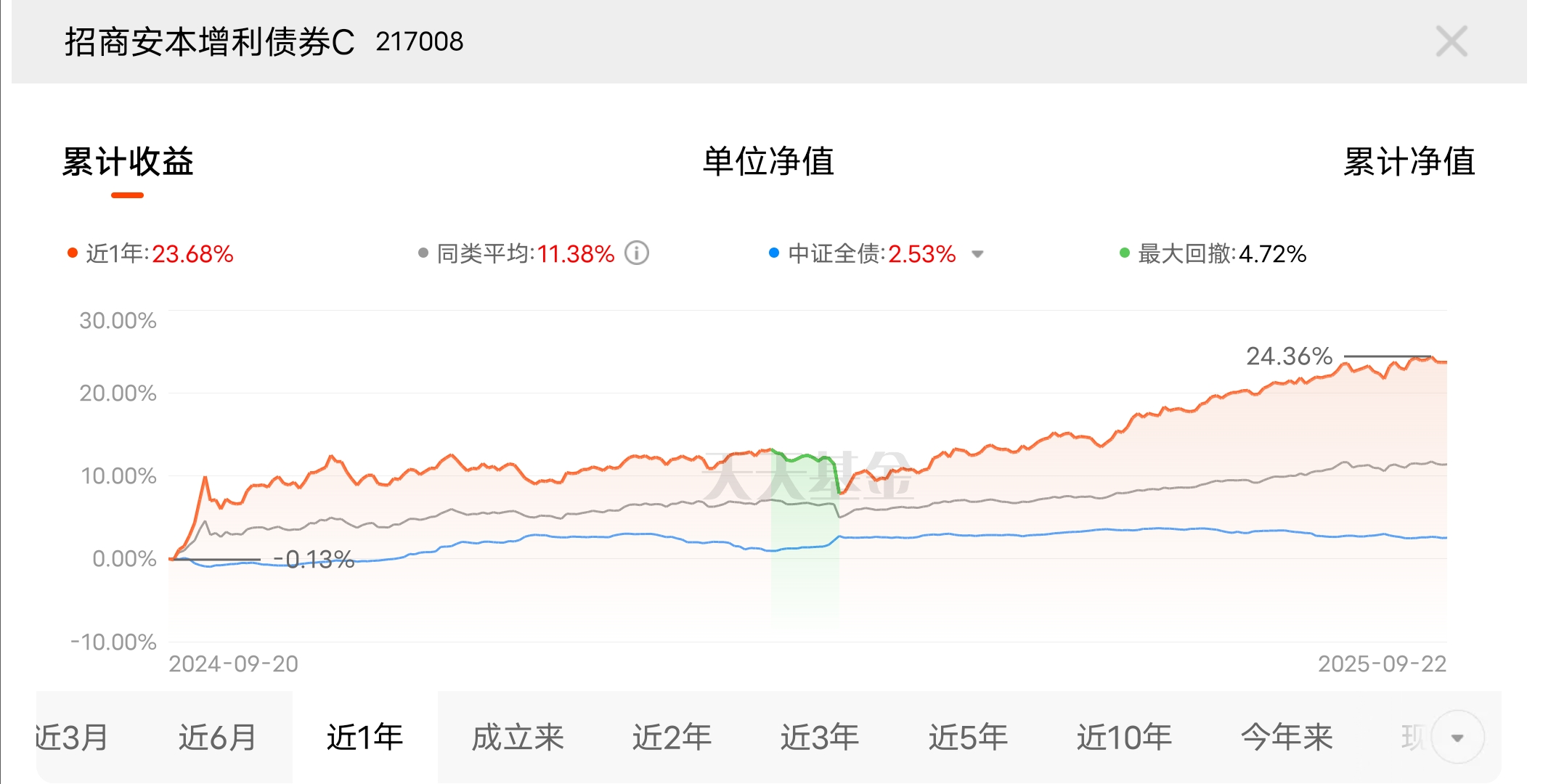 翻基金数据时看到它,招商安本增利债券C作为固收+产品,近1年涨23.68%,跑赢