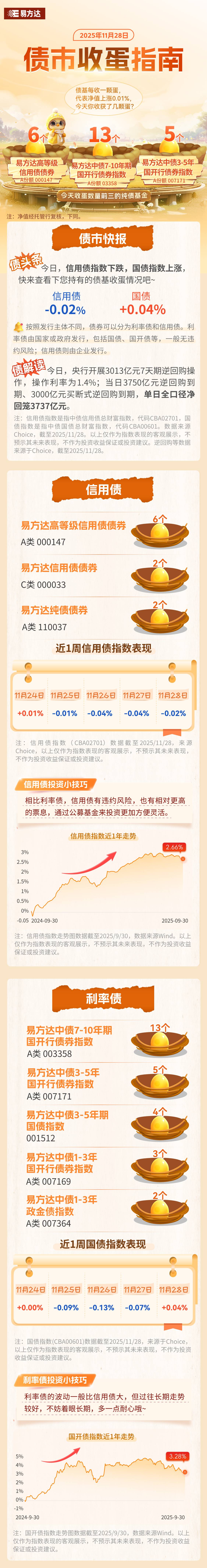 11月28日,信用债指数下跌、国债指数上涨,快来查看您持有的债基收蛋情况吧!