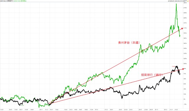 我下面做了张对比图,是贵州茅台和招商银行的历史股价走势。大家可以看到,尽管贵州茅台的涨幅更大,但如果在阶段性高位买入,承担的回撤也会非常大。而尽管招商银行的涨幅更小,但即使在阶段性高位买入,回撤也相对比较小。