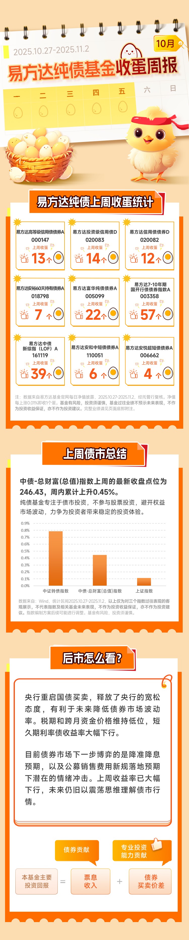 注:数据来自易方达基金官网每日净值披露,2025.10.27-2025.11.2,经托管行复核。净值每上涨0.01%即收1个蛋。基金有风险,投资须谨慎,基金过往业绩不预示未来表现,不作为投资收益保证,亦不作为投资建议。完整业绩请见页面底部附注。
