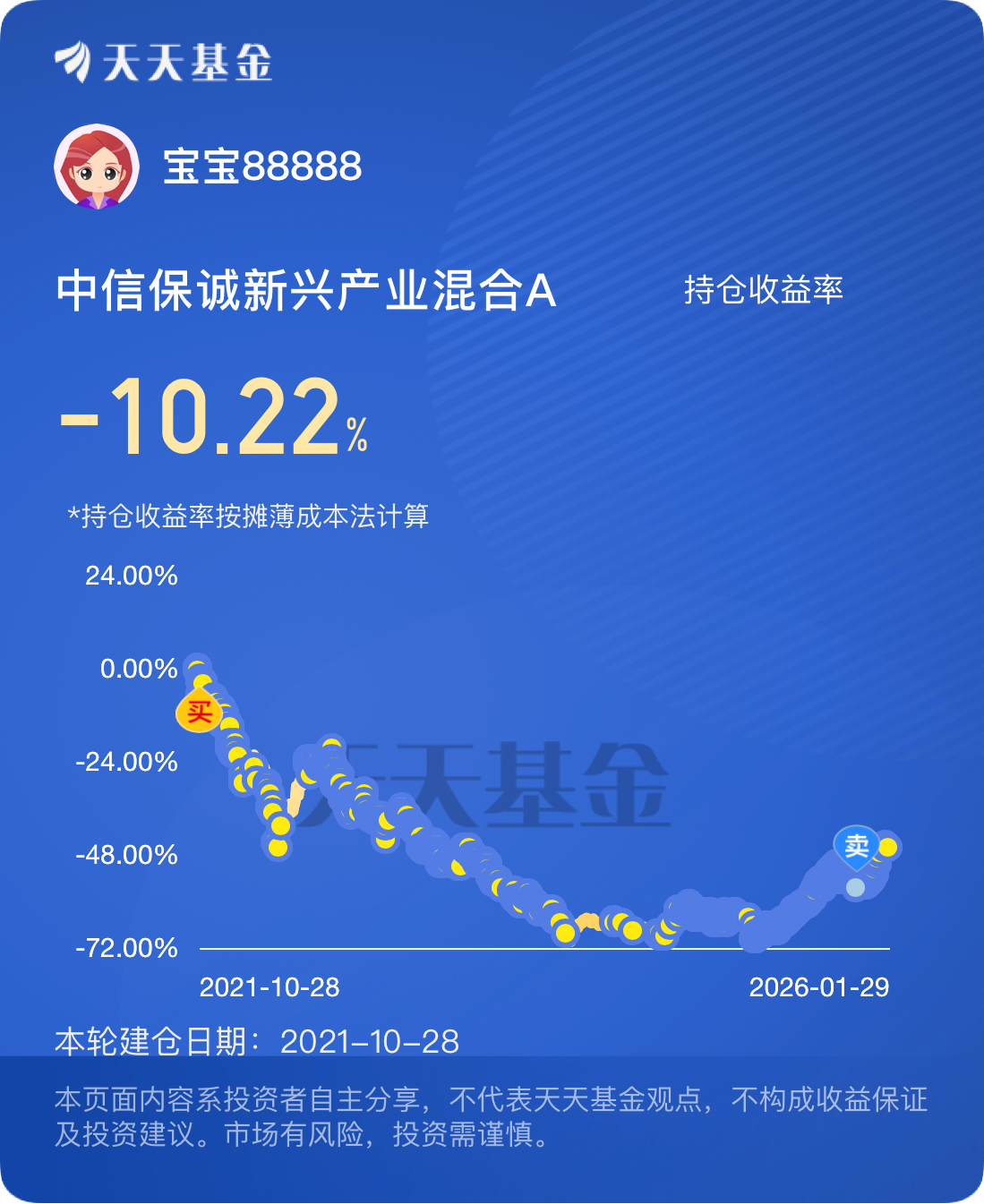 只要跌就买100块钱,终于把好像当初7块还是6块钱的买到3块多了!我不割肉就伤害不到我,加油今年争取涨回来$中信保诚新兴产业混合A$
