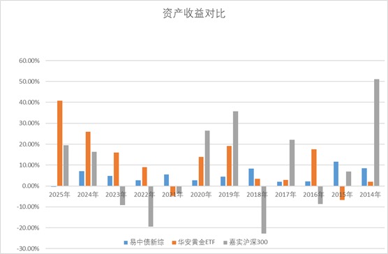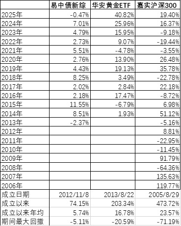 附件中债新综、黄金ETF、沪深300成立以来对比