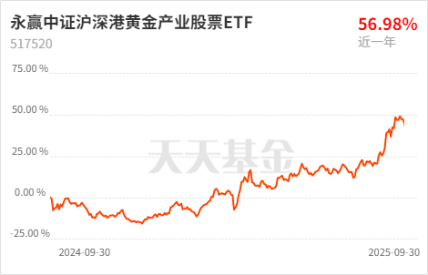 近1年涨幅靠前三的分别为黄金股ETF(159562,涨58.05%)、黄金股ETF(517520,涨56.98%)、黄金股ETF基金(159315,涨56.15%);