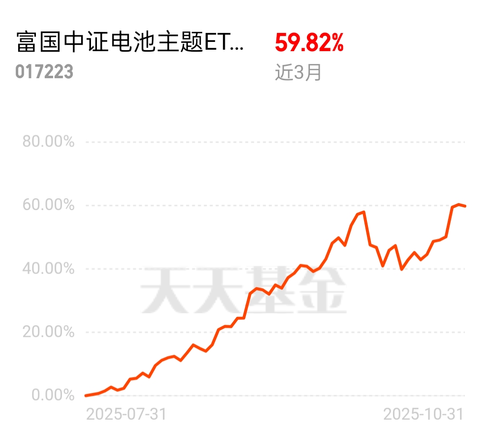 买了华安黄金ETF联接A避险,顺手配了点富国中证电池主题ETF联接C抓机会——近6个月涨了77%,跑赢大多数同类,电池、新能源车、电力设备这几个方向势头正猛,估值还比过去五年40%的时间都便宜,拿着踏实!$富国中证电池主题ETF发起式联接C$