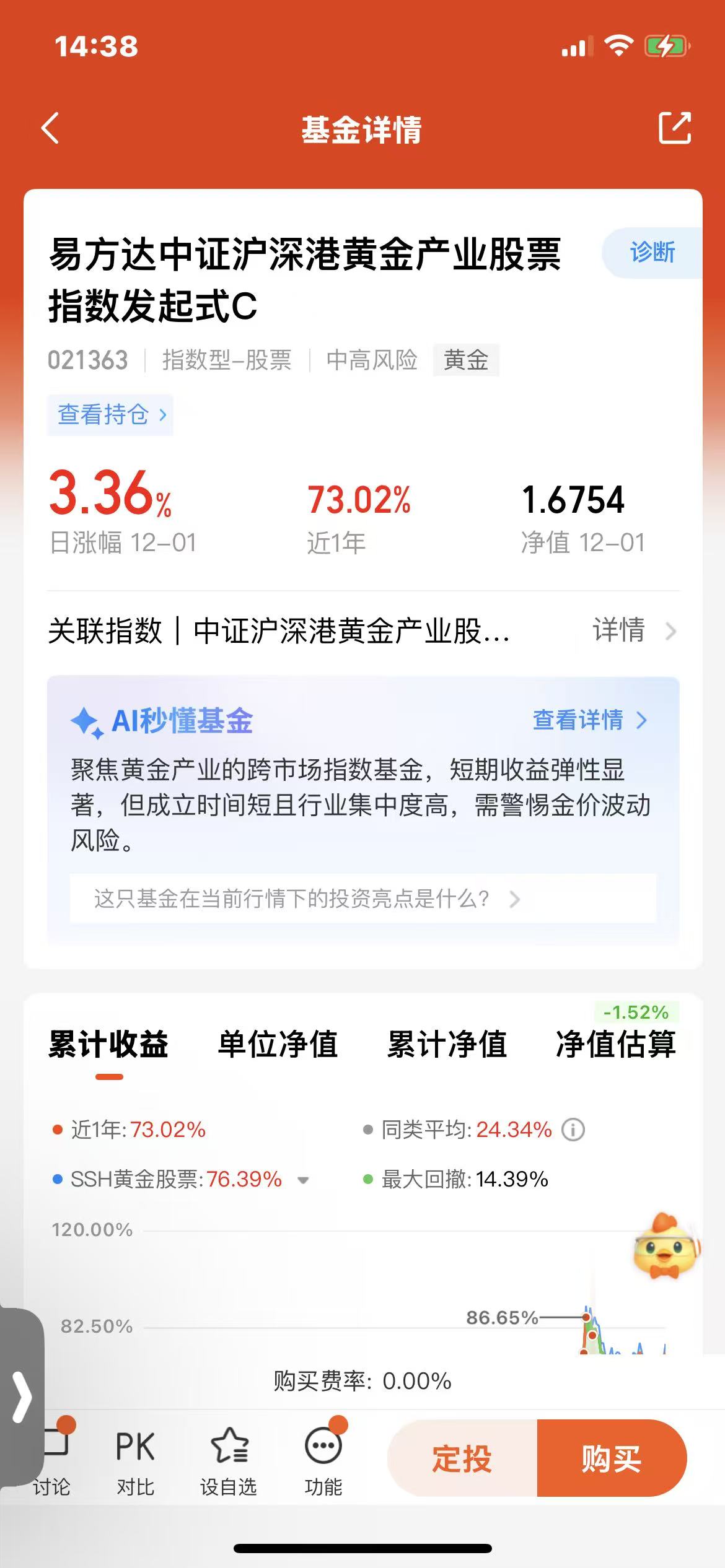 不过整体来看,黄金股近期上涨还是不错的;并且也开始追赶海外黄金股涨幅,从历史数据来看黄金股的行情不会先于黄金行情结束;昨天$易方达中证沪深港黄金产业股票指数发起式C(OTCFUND|021363)$黄金股上涨3.36%,也是很强悍的。