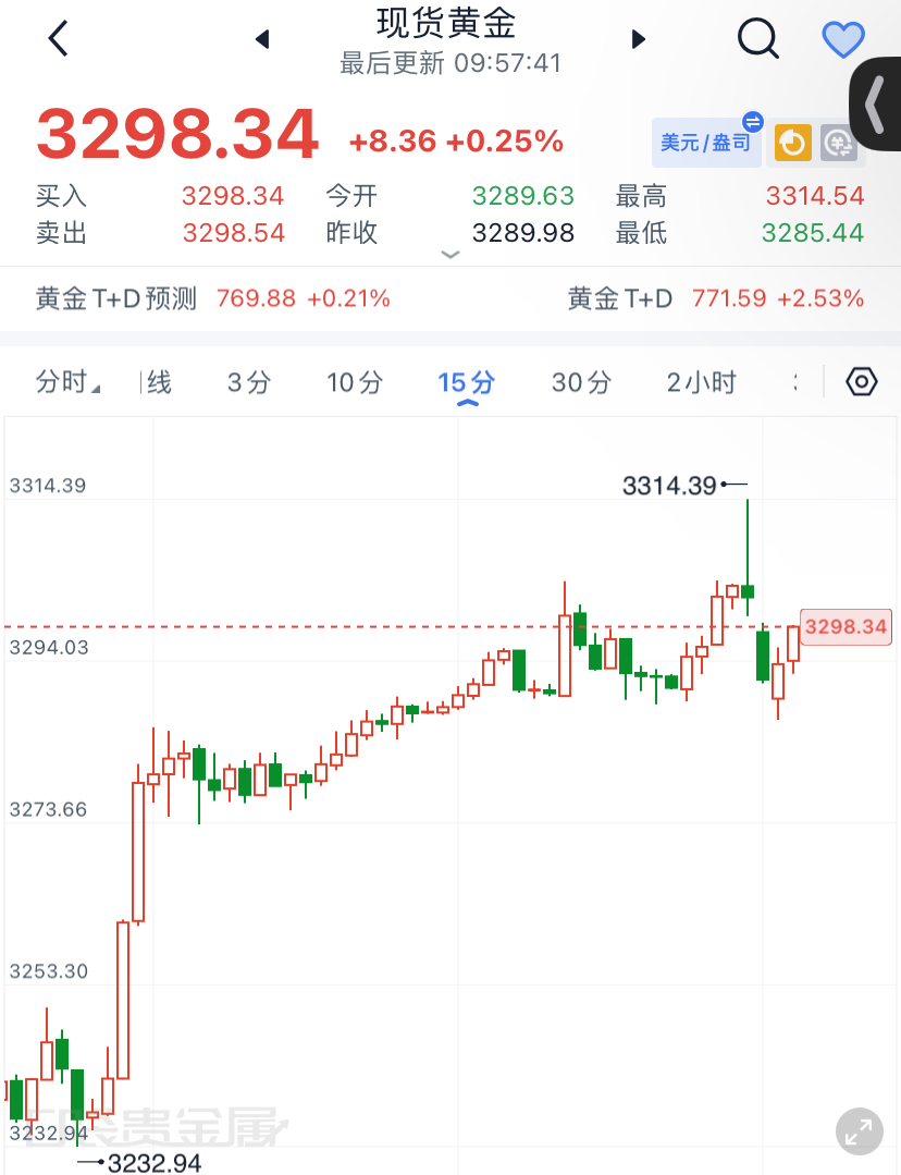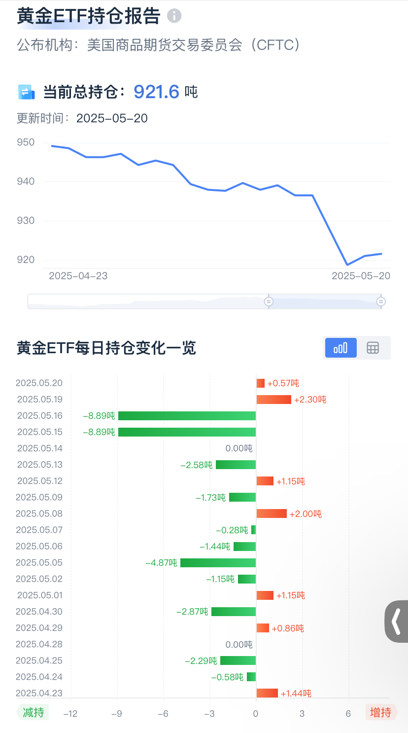 大家早上好,目前现货黄金3298,涨幅+0.25%,黄金大幅上涨,连续第二个交易日反弹,盘中最高触及3314后略有回落,随着金价再度上涨,黄金ETF持仓较前一个交易日增加0.57吨,全球最大的黄金ETF持仓总量为921.60吨。